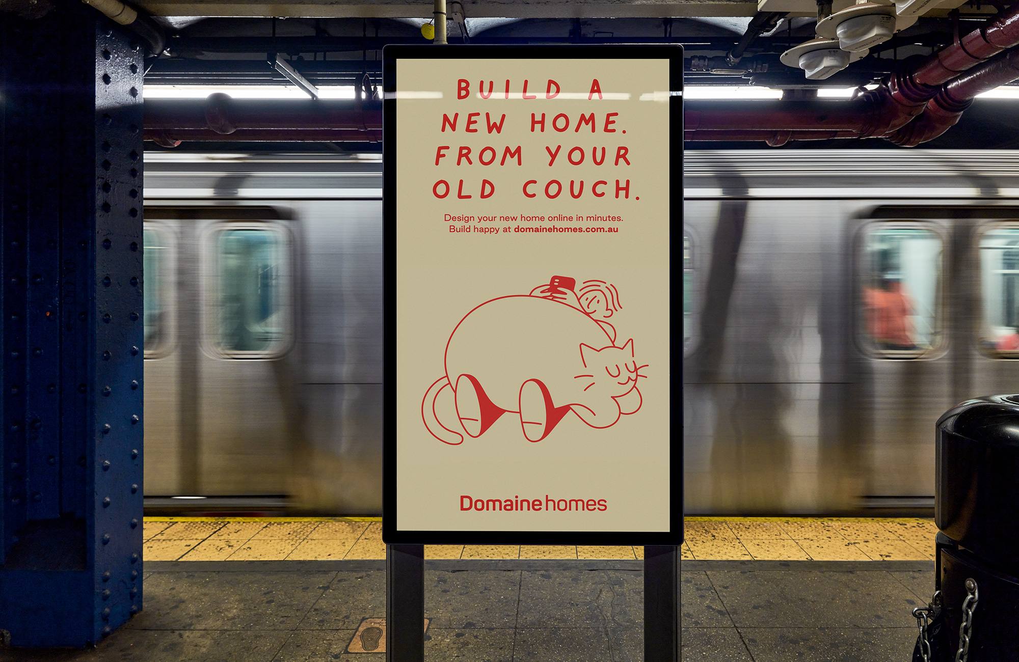 In a market of corporate mumbo-jumbo, the campaign tone is a breath of fresh air. Instead of screaming about promotional deals or simply describing the product, conversational copy lines feature pop-culture references, call out iconic bugbears and speak frankly about why building with Domaine Homes means people can truly build happy. To bring the copy lines to life, we created kooky, clever and imaginative illustrations that shake category norms – injecting fun back into the equation. Instead of selecting a standard typeface, we developed a handwritten alphabet. This style allows campaign lines to feel human and plain-speaking – these aren’t standard corporate lines or empty promises.